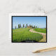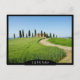 Postcard of a curvy road through the grain crops towards a farm villa with a row of cypress trees in front of it near Pienza in Val d'Orcia valley in Tuscany, Italy with a black edge and in a black box the text 'Tuscany'.