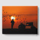 A farmer and a tractor are silhouetted in front of a brilliant sunset.