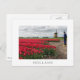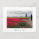 Postcard of a farmer wearing yellow wooden shoes inspecting his red tulips with in the background a traditional windmill in spring in the flower Bulb Region in the Netherlands with a white border and the text 'Holland'.