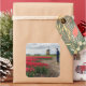 Photo sticker with a farmer wearing yellow wooden shoes inspecting his red tulips with in the background a traditional windmill in spring in the flower Bulb Region in the Netherlands.