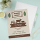 A vintage-style & rustic flyer for a farmers' market, all in beige, brown and green colours. It comes with leaves and a silhouette illustration including a tractor, a cow, a pig and a chicken.