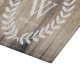 Farmhouse style glass cutting board with white laurels over a barn wood planks print background. It features personalised family name text.