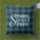 Unique, elegant and decorative farmhouse style pillow with cute Farm Sweet Farm quote text, on a classy blue and black coloured Buffalo Lumberjack tartan checks pattern design.