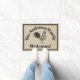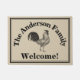 Welcome your family and guests with a unique doormat decorated with a vintage image of a rooster and your family name paired with the expression "Welcome!" The mat is a neutral beige and has a simple printed border.