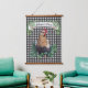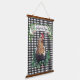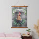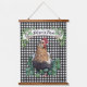 This farmhouse style Hanging Tapestry features an all over black and white gingham check pattern with a chicken in a patch of clover. A banner above the truck can be personalised with your name.