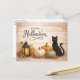 A warm and inviting farmhouse-style Halloween illustration set against a whitewashed wood backdrop. A softly glowing lantern casts gentle light over a trio of heirloom pumpkins in creamy white, sage green, and classic orange, nestled among crisp autumn leaves and scattered acorns. A calm black cat sits nearby, adding a touch of Halloween charm without spookiness. The elegant, hand-lettered “Happy Halloween” typography completes the scene, creating a cozy, rustic atmosphere that feels more harvest celebration than haunted night.