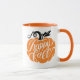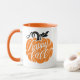 This farmhouse style mug features a pumpkin design with the words "Happy Fall." On the back is a duplicate design.