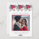 A red frame surrounds your engagement photograph. Three large red poinsettia flowers nestled in winter greenery form a farmhouse style floral border. The same floral motif forms a smaller posey at the bottom of the save the date card. Your names, wedding date and location are written in a soft grey text. The red plaid background on the back of the save the date invitation continues the farmhouse design style.