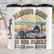This is a rustic graphic design with a farming theme. The central image is a stylised landscape featuring a classic tractor and a traditional barn with a windmill. The scene is set against a background of a sun with rays and a two-toned sky in orange and blue. The phrase "FARMING RUNS IN OUR FAMILY" is prominently displayed at the top and bottom of the image in a bold, weathered font. The design is enclosed at the bottom by a fence with decorative wheat bundles.