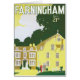 Vintage travel poster for transportation excursions to Farningham in Sevenoaks, Kent, England in an art deco style illustration with simplistic lines and colour blocking.