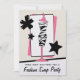 A fashion clothing swap party invite featuring an illustration of a zebra print and pink dress form surrounded by decorative black stars and a pink, black, and white background. Personalise the text on front and back.