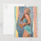 A beautiful woman from a a magazine photo from 1957 poses in her swimsuit on the beach in a collage on a vintage textbook page with random colorful lines on it