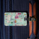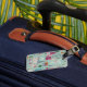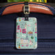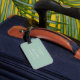 Travel in style with this chic luggage tag featuring a fashionable woman exploring iconic world cities. The illustration includes London, Paris, Rome, and New York with stylish outfits, cafés, and travel scenes on a soft mint background. Perfect for fashion lovers, frequent flyers, and stylish travelers who want their suitcase to stand out with a feminine travel accessory. Original artwork by Caroline Bonne Müller.