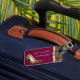 Chic lady's luggage tag done in maroon, with graphics of a brown and black jaguar fur pattern, with an ivory ribbon, and a pair of jaguar print stiletto high heels, on the front. Personalise the ivory text to suit your needs. A stand out luggage tag that is hard to miss.