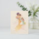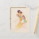 Pretty young Victorian mother in gold gown and purple bonnet on stairs with her daughter who wears a pretty white frock painted in pastel watercolor style. Back features editable message, text fields and optional floral graphic with custom complementary background.