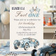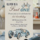 Fast One 1st Birthday Blue Race Car Boy Invitation with a vintage blue race car and checkered flag details. Perfect for a boy’s first birthday, this design is a fun choice for a race car theme with a classic sporty look.