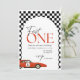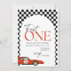 Modern and Fun Invitation to celebrate your little racer's first birthday. Fast One Birthday Invitation chequered background.