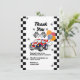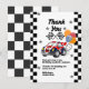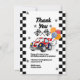 Send high-speed thanks with this boys’ racing-themed thank you card! Featuring red, blue and orange accents and chequered flags, it’s perfect for race car or “fast one” birthday parties.