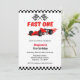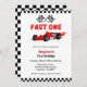Birthday party invitations from Fast One feature a red automobile. This adorable race car-themed birthday party is for a first birthday and features the words "fast one" and a picture of a red vintage car.