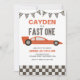 Fast One Race Car 1st Birthday Invitation with blue retro race car.