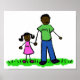 Father and daughter hold hands. The father's shirt reads "daddy" and the little girl's shirt reads "me". The family has black hair and dark skin. The image comes in multiple ethnic family versions including a no colour drawing version too. Add your own words to the poster art print like "Daddy's Girl" or family names. Change the background art colour too! Customise this poster art print with your personalised greeting message to make special custom family character posters for Father's Day, new fathers, family reunions, or other special family holidays.