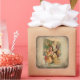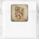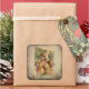 Victorian-era Christmas card art featuring Father Christmas in fur-trimmed purple robes giving presents to children at train station on distressed artisan sepia background.