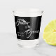 A great barware gift for the Father of the Groom! Shot glass with bride and groom names and wedding date with "Father of the Groom" printed in stylish, white script on a black background. Personalize your shot glass by editing and replacing bride and groom names and wedding date with your own.