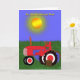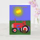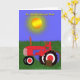 A unique and original red tractor design with fishing pole and tackle bag next to a pond in the field. Perfect greeting card Father’s Day for those who love tractors!