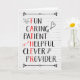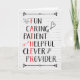 Father's Day card for dad with descriptive words, including fun, caring, patient, helpful, clever, provider, with certain letters which spell out "FATHER" Card has distressed white brick background and rabbit, heart, arrow and light bulb doodles. Change the inside verse, if you'd like.