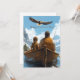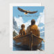 Pretty watercolor image a Father and Daughter going fishing they are sitting in a wooden row boat on a beautiful lake. There is a beautiful Bald Eagle flying across the bright blue sky