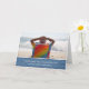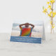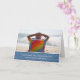 This Father's Day card a photograph of a grey haired man relaxing in a colourful rainbow chair on an ocean beach watching the crashing waves.
