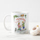 White mug with children writing messages of appreciation for their Dad on a wall. Two cats looking on.