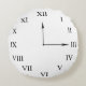 A design made to mimic a clock face with black roman numerals against a white background complete with a black hour hand and a black minute hand on a fun throw pillow.