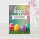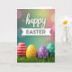 This card shows four decorated egg shapes resting in a thick patch of green grass, arranged side by side along the lower third like friends leaning close for a photo 🐰. Each egg has its own look: one is red with neat white stripes, another is yellow with white dots, a third is purple with white dots, and the last is green with matching white dots. Above them, the word “happy” appears in flowing white lettering, centred and floating in the open space. Directly beneath it sits a slim white banner that holds “EASTER” in dark, simple all-caps letters, giving the message a tidy, balanced layout. The background fades into a soft blur of warm pinks, pale yellow, and gentle teal, with round light spots that feel like distant lanterns on a spring evening 🌷. The lighting is diffused and gentle, making the colours look rich while keeping the scene calm and inviting. Behind the text, the bokeh circles drift across the top half, while the grass blades below stay sharp and textured around the eggs.