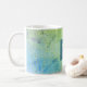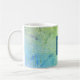 This coffee mug offers an elegant design in teal and green and is accented with geometric lines of light green faux glitter. A dark teal box, in the centre, offers a custom monogram.