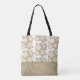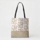 This tote bag is shown with a cute tropical flowers print design in a Tan colour on a white background colour with faux Gold coloured glitter accent strip at the bottom.