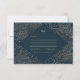 This chic wedding invitation set features a dark blue background and a faux gilded geometric frame made of botanical elements. At the back is a luxurious faux gold design. Modern typography adds an elegant twist to this minimalist design by Kitty Pie Prints.