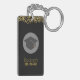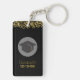 A keychain which says: Class of 20xx. The back can be personalised with your name and phon number or other text. Designed with fake gold confetti glitter. Set on a black background. Illustrated with a black graduation cap with a semi-transparent circle behind. Elegant and chic.
