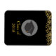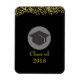 A flexible magnet which says: Class of 20xx. Designed with fake gold confetti glitter. Set on a black background. Illustrated with a black graduation cap with a semi-transparent circle behind. Elegant and chic.