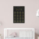 Wedding seating chart for sixteen tables with a printed black chalkboard background and gold-coloured text and confetti, and elegant fonts. Note: the gold colours are printed effects, not real gold foil.