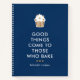 Chic recipe notebook in blue and white and faux gold glitter with "good things come to those who bake" written on the cover in a modern font beneath a white cupcake with frosting decorated with little golden hearts. Personalise with your name.