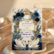Set the tone for a fairytale celebration with this sophisticated stationery suite. Perfect for announcing a formal royal blue wedding with elegant romance.This design features a pair of elegant white swans facing one another, creating a gentle heart shape over a reflective water effect. The scene is framed by an ornate, faux gold foil baroque crest intertwined with lush watercolor florals. The botanical arrangement showcases deep navy and royal blue roses, accented by dusty blue blooms and soft sage green eucalyptus foliage. The background simulates a soft gray marble stone texture for a luxurious finish. The typography combines a flowing, handwritten calligraphy script with a classic serif font. This is a flat printed image with a printed gold foil and marble texture effect, not actual raised foil or stone material.