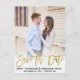 Send our portrait picture wedding save the date postcards with a faux gold foil script to let your guests know to block off your wedding date. You can choose from one of the available predesigned colour schemes, or you can select one of the flat coloured designs (with black text, for example) and then be able to change the colours to whatever custom colour you would like.  Just click on the "Edit Design" button, click on the text you would like changed, and then add your custom colours. Be sure to check out our large selection of photo save the date cards, postcards, and magnets by browsing our Picture Save the Date collection!