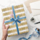 Customise this stylish Faux Gold Glitter Happy Birthday Custom Wrapping Paper, designed with gold and white horizontal stripes and with custom text and name written on them. Please note that the gold glitter is a colour print and is not an actual glitter or metallic gold foil.
