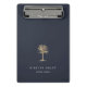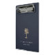 Chic personalised clipboard features two lines of custom text in classic white lettering, on a navy blue background adorned with a tropical palm tree illustration in faux gold foil. Design repeats on reverse side. Please note that this clipboard is a mini size; full size version also available in our Gold Palm Tree collection.