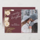 Unique cute and decorative Holiday season greeting card. With pretty white and faux gold coloured pine cones and needles floral arrangement pattern design on a classic dark mauve pink background. With room to easily customise or personalise with a photo of your choice, your family name and text on the backside of the card.
