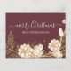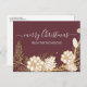 Unique cute and decorative Holiday season greeting card. With pretty white and faux gold coloured pine cones and needles floral arrangement pattern design on a classic dark mauve pink background. With room to easily customise or personalise with your family name and text of your choice.