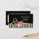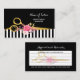 A trendy black and white stripes hair salon appointment card with a pair of elegant faux gold hair cutting scissors, embellished with a sprig of beautiful pink and gold flowers. Personalise this gorgeous hair and beauty design by adding the name of the salon, occasion, and contact information. There is a box reserved for writing in your appointment information. Flat printed image, not gold foil.