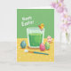 This card features a springtime egg-dyeing scene with a clear glass filled with rich emerald-green liquid at the center. A round little yellow chick with orange wings balances on the rim, leaning in as if sharing a friendly moment with the viewer 🐣🌷. Around the base sit several decorated eggs, arranged close together like they’re keeping each other company. One egg is bright blue with scattered pink and orange dots, another is creamy with pink stars and stripes, and another is deep magenta with neat white polka dots. A green egg nearby has fine white leafy lines that echo a garden pattern, tying the colors together. In the foreground, a slim paintbrush rests on a sunny yellow surface dotted with small white spots, suggesting the next egg is about to be painted 🐰. Behind everything, a light green background holds large white text near the top as a simple Easter greeting.