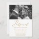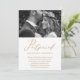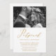 Elegant change the date wedding postponement announcement. This simple announcement is a chic way to let invited guests know that your wedding date has been rescheduled due to unforeseen circumstances, and includes the new wedding date. This trendy announcement features beautiful "postponed" faux gold calligraphy script on a white background with the couple's photo.